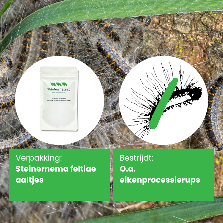 Met Steinernema feltiae aaltjes kan je bovengronds de eikenprocessierups bestrijden. De aaltjes dringen binnen bij de rupsen en besmetten ze met een bacterie. Deze bacterie vermenigvuldigt zich in de rups, waarna deze sterft.