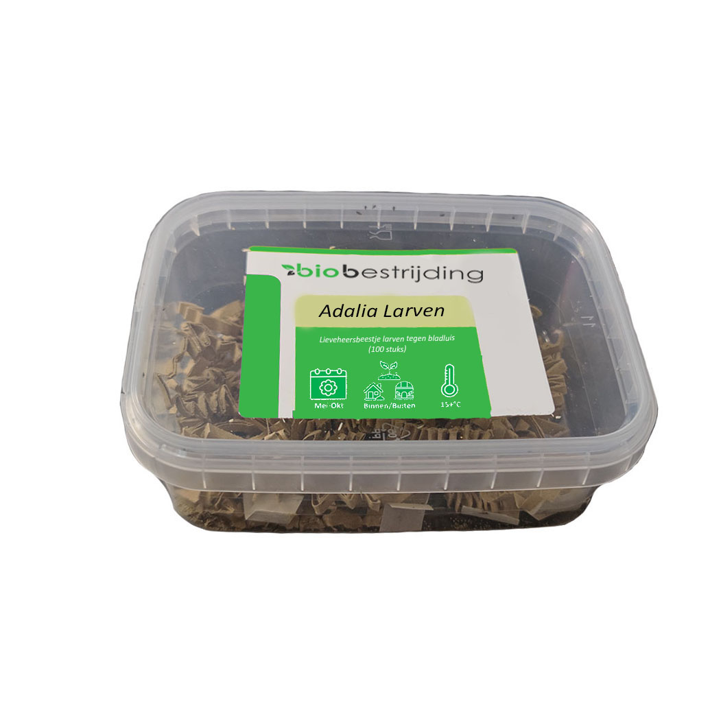 Ter bestrijding van bladluizen kunt u lieveheersbeestje larven inzetten. Bladluizen behoren tot één van de bekendste plagen en kunnen grote schade aanrichten door hun besmetting. De groei van de geïnfecteerde plant is verstoord, ernstige besmetting kan zelfs de plant doden. Als oplossing hiervoor leveren wij lieveheersbeestje larven van het type Adalia bipunctata. De larven zijn de ideale bestrijder van bladluizen aangezien de larven nog moeten groeien en zich dus flink vol eten om uit te groeien tot een volwassen roofkever (lieveheersbeestje). Een larve eet gedurende 2 weken zo'n 800 bladluizen op, tijdens de gehele levensduur (25-30 dagen) van dit lieveheersbeestjes kunnen deze aantallen zelfs oplopen tot 4.000 bladluizen.