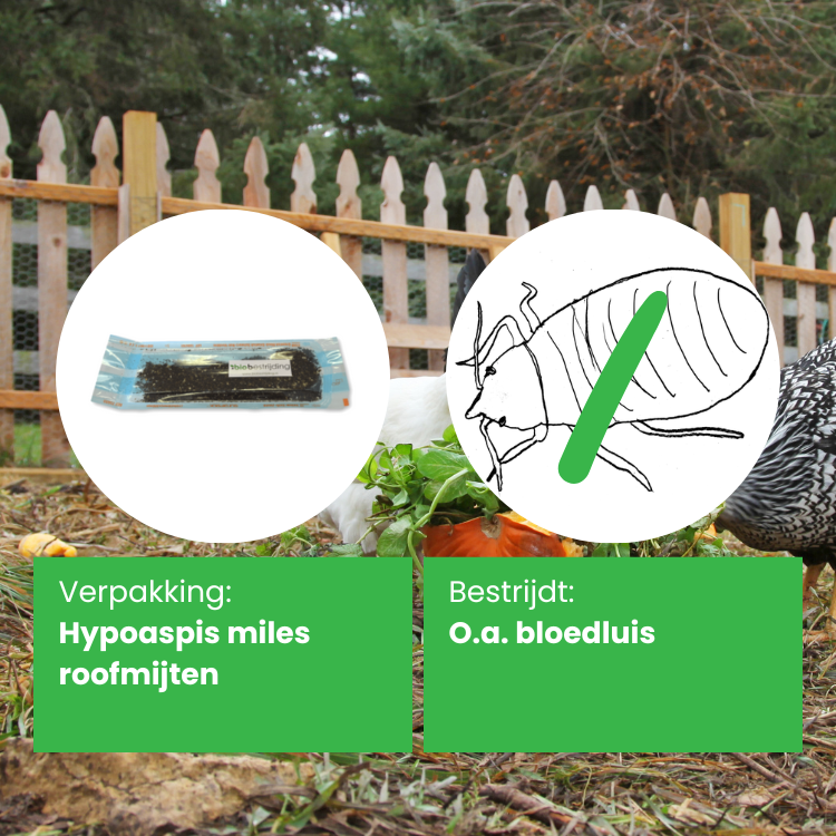 Maak gebruik van roofmijten tegen bloedluis om de vervelende bloedluizen te voorkomen of bestrijden. Volledig biologisch en zonder schadelijk gif. De Hypoaspis miles roofmijt (ook bekend onder andere namen zoals Stratiolaelaps scimitus) is geschikt voor de natuurlijke biologische bestrijding van bloedluis bij jouw gevogelte. Reken per dier tussen de 150 en 250 roofmijten.