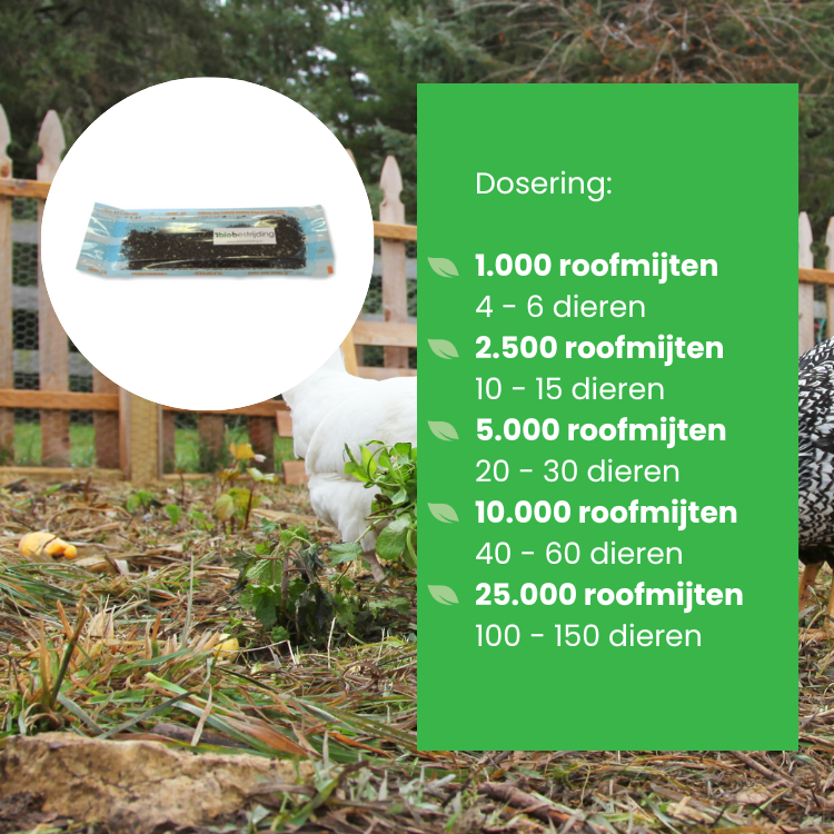 Reken per dier ongeveer 150 tot 250 roofmijten per dier. De benodigde hoeveelheid is afhankelijk van de grootte van het hok en de hoeveelheid dieren. Het meest effectief zijn de roofmijten bij een preventieve inzet of als je de eerste tekenen van een plaag ziet. Onder de juiste omstandigheden kan de roofmijtpopulatie goed vermenigvuldigen en de bloedluizen bestrijden.