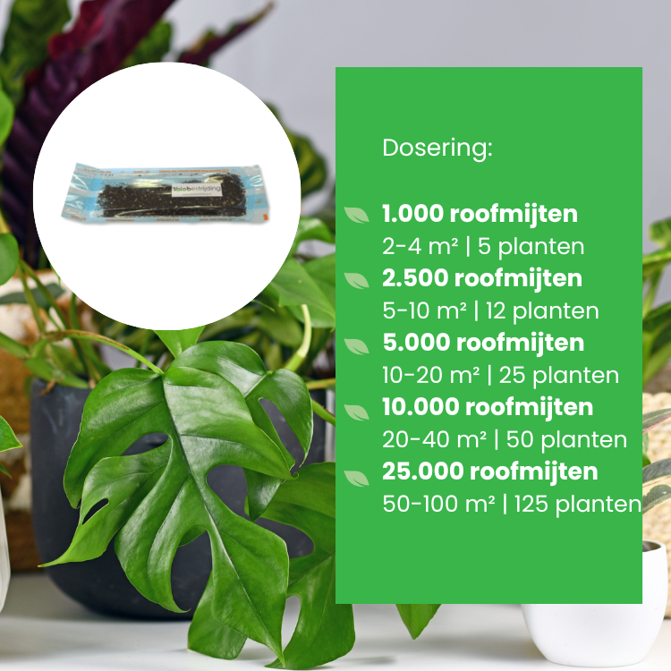 Afhankelijk van hoe hevig de plaag is, heb je zo’n 250 tot 500 roofmijten nodig per m². Om de voortplantingscyclus van de springstaarten te doorbreken, is aan te raden om de behandeling met roofmijten na twee weken te herhalen. Gebruik dan een onderhoudsdosering van 250 roofmijten per m².