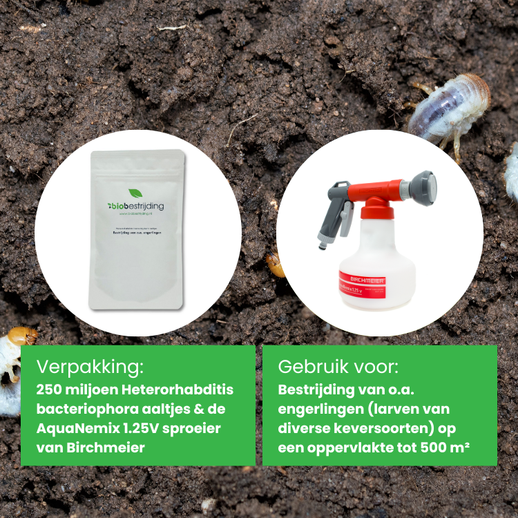 - 250 miljoen Heterorhabditis bacteriophora aaltjes, dit is genoeg voor een oppervlakte van 500 m²