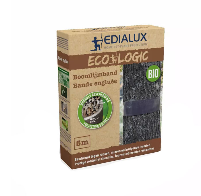 De Edialux boomlijmband werkt als een sterk schild voor de boom en beschermt de stam tegen kruipende insecten, zoals bladluis, mieren en motten. De insecten blijven vastzitten op de plaklaag en kunnen daardoor geen schade meer aanrichten. De lijm op de band droogt niet uit en is regenbestendig. De boomlijmband is zo’n 6 maanden werkzaam. De band heeft een schuimrubberen onderlaag die een dubbele barrière vormt en zich aanpast op alle soorten schors.