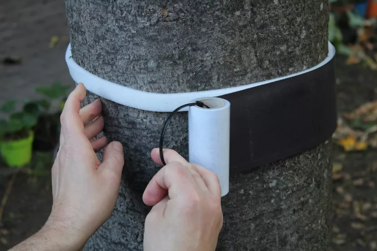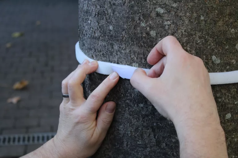 - Meet de omtrek van de stam en knip de lijmband met de juiste lengte. Houdt rekening met 5 tot 10 centimeter te veel, dan overlapt de lijmband mooi.
