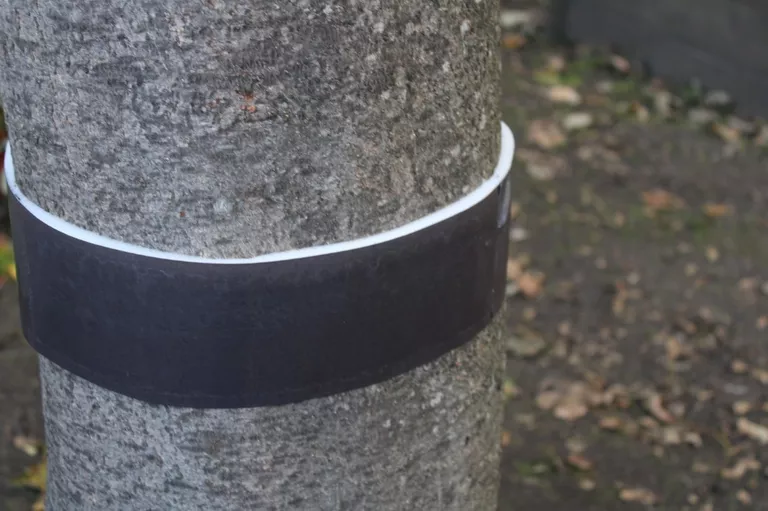 - Hang de boomlijmband zo’n 60 tot 100 centimeter boven de grond, net onder de eerste takken. Is de stam erg ruw? Dan is het handig de schors eerst glad te schuren en de lijmband strak tegen de boom te spannen.