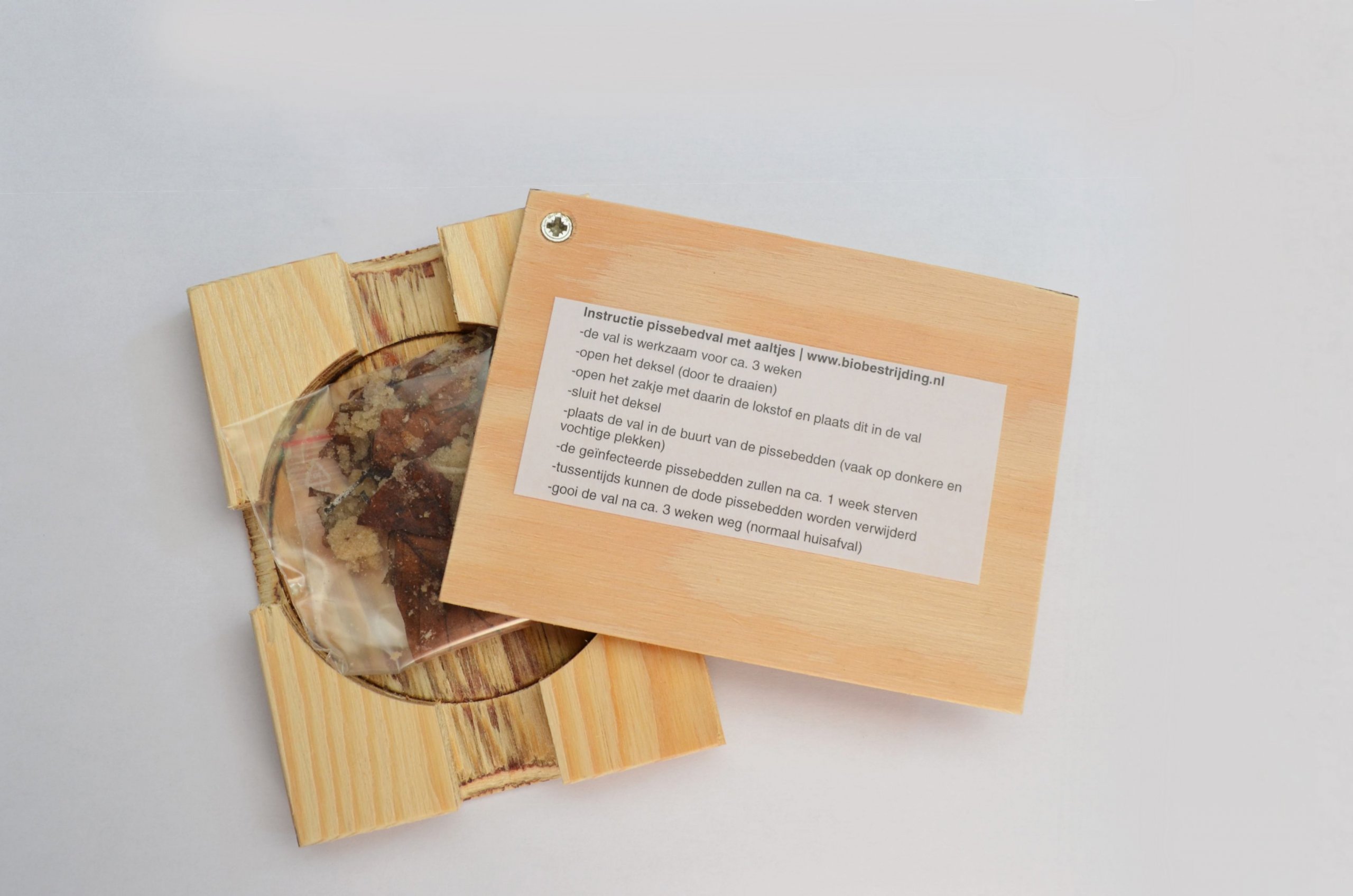 Met een aaltjesval kan je pissenbedden bestrijden op een biologsiche en veilige manier. De houten pissebedval is voorzien van lokaas en parasitaire aaltjes. De pissebedden kruipen in de val, waar ze worden besmet met aaltjes. Binnen enkele dagen sterven de pissebedden en worden ze opgenomen in de natuurlijke kringloop.