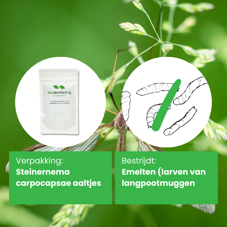 De Steinernema carpocapsae aaltjes (nematoden) zijn inzetbaar als biologische bestrijders van de larven van diverse plaaginsecten. De Steinernema carpocapsae aaltjes (nematoden) is vooral bekend als effectieve bestrijder van de larven van langpootmuggen, of te wel emelten. Aaltjes zijn van nature in de bodem voorkomende parasitaire wormen (Nematoden) die minuscuul klein zijn en onzichtbaar voor het oog. Doordat de aaltjes zeer klein zijn, zullen zij de emelten binnendringen en daar hun bacteriën verspreiden. De bacteriën die de parasitaire aaltjes achterlaten vermenigvuldigen zich en infecteren op hun beurt de emelten die vervolgens zullen sterven. Zodra de gastheer (in dit geval de emelten) is gedood verlaten de aaltjes deze en gaan op zoek naar nieuwe gastheren. Zolang er prooien in de bodem aanwezig zijn kunnen de aaltjes zichzelf in stand houden en zich vermeerderen.