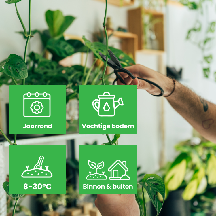- Zorg ervoor dat de bodem van de plant vochtig is (niet drijfnat) voordat je de aaltjes uitzet. Aaltjes hebben vocht nodig om te overleven.